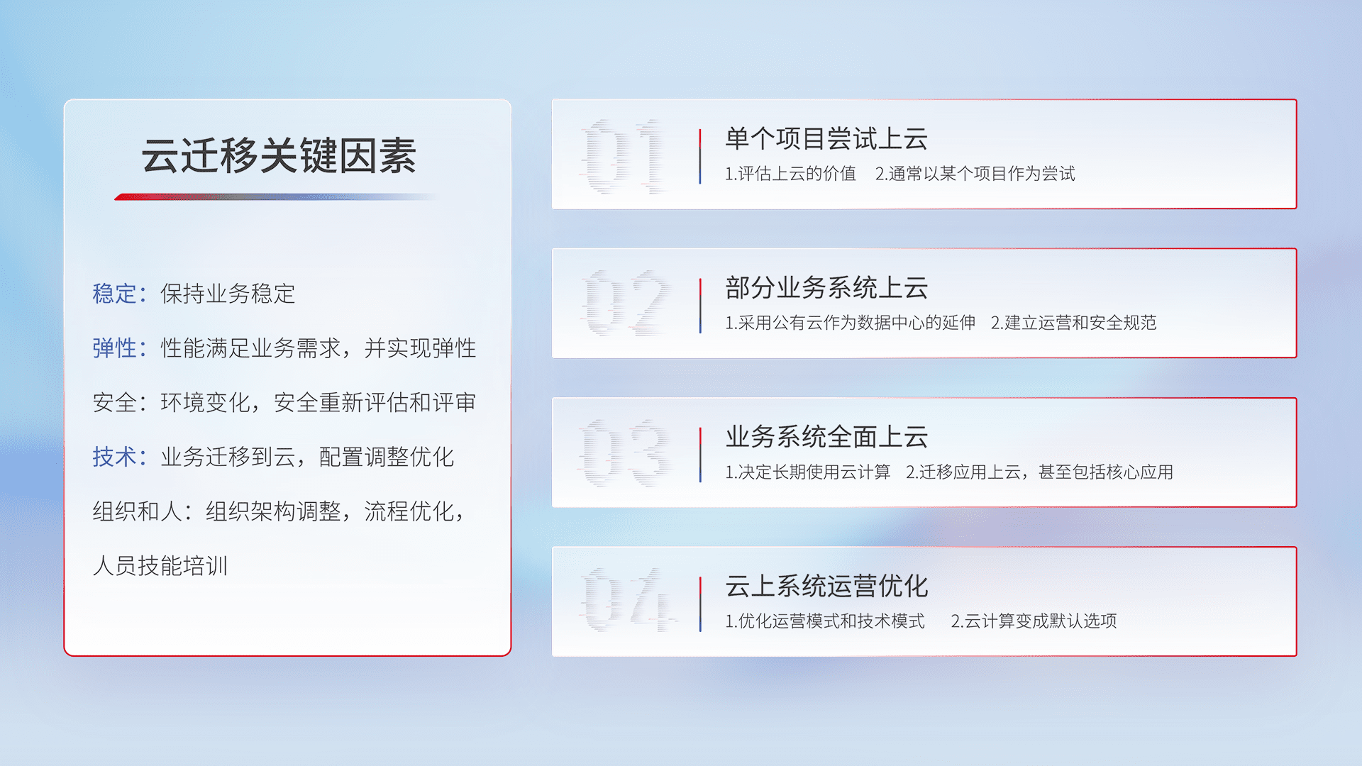 结合实际业务,,,,从规划设计、、、、云平台选型、、、、云原生改造、、、数据迁移、、、、集成交付,,迁移全过程为客户识别最佳上云路径,,,,做好风险识别管理,,,设计网络架构、、身份权限、、、安全审计合规、、、操作审计、、、、日志审计、、、、监控告警策略、、、多站点容灾设计等,,对云上基础设施进行整体规划,,提升IT治理水平,,,,以满足弹性、、高可用、、、、高性能的需求。。。。